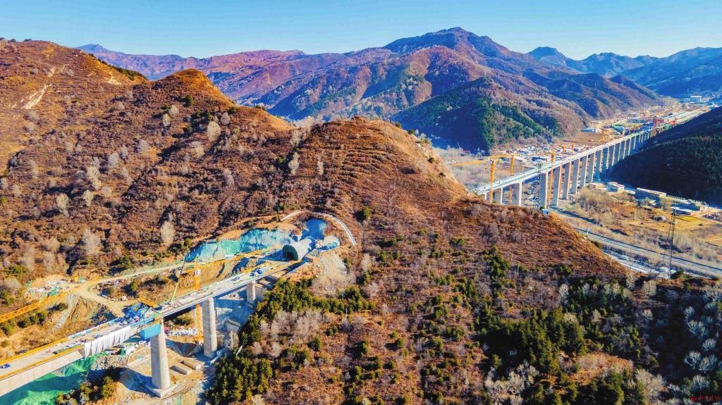 11月14日,雄忻高鐵五臺山段工程建設(shè)正在全速推進(jìn)。航拍鏡頭下,高鐵線路蜿蜒穿行太行層巒,與深秋遺韻、初冬新寒相映,盡顯基建與生態(tài)協(xié)調(diào)的壯美圖景。(記者范琛攝)