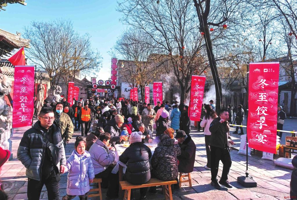 12月21日,忻州古城一年一度的冬至餃子宴在泰山廟巷開(kāi)席,千余名市民和游客歡聚在這里,吃餃子、聽(tīng)曲藝,共迎冬至。(