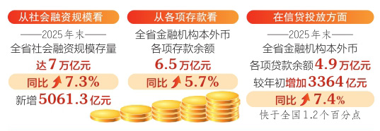 從社會(huì)融資規(guī)???,2025年末,全省社會(huì)融資規(guī)模存量達(dá)7萬(wàn)億元,同比增長(zhǎng)7.3%;新增5061.3億元。其中,投向?qū)嶓w經(jīng)濟(jì)的本外幣貸款和政府債券凈融資增量合計(jì)占全部社融增量的94.4%。