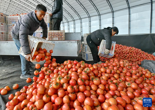 12月29日,肅寧縣萬里鎮(zhèn)一家蔬菜種植合作社的社員將收獲的西紅柿卸車。(新華社記者 楊世堯 攝)