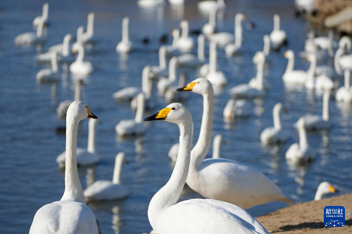 1月5日,大天鵝在榮成大天鵝國家級自然保護區(qū)棲息。(新華社記者 徐速繪 攝)