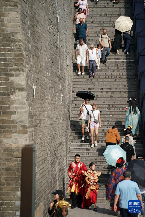 游客在西安城墻永寧門內(nèi)游覽,左側(cè)城墻上布設(shè)著城墻病害數(shù)據(jù)傳感監(jiān)測設(shè)備(2025年9月12日攝)。(新華社記者 邵瑞 攝)
