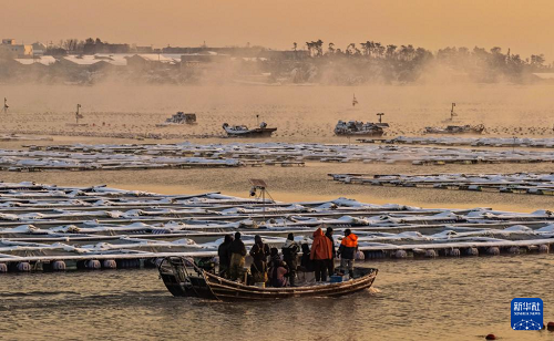 1月12日,雪后的山東省榮成市愛(ài)倫灣海洋牧場(chǎng)出現(xiàn)“海浩”景觀。據(jù)悉,“海浩”景觀是一種在嚴(yán)寒天氣下出現(xiàn)的自然奇觀,表現(xiàn)為海面或湖面上水汽蒸發(fā)后遇冷凝結(jié),形成白茫茫的霧氣,如同水面沸騰一般。