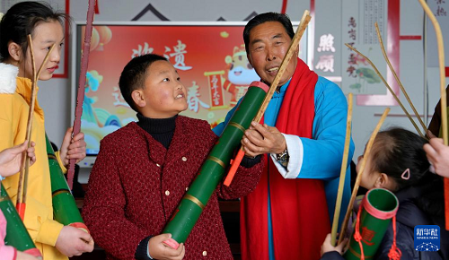 2月13日,文化志愿者在江蘇省海安市墩頭鎮(zhèn)墩西村教寒假公益托管班的學(xué)生學(xué)唱省級非遺“水鄉(xiāng)道情”。(新華社發(fā) 周強(qiáng) 攝)