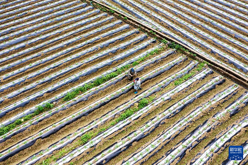2月25日,河南省沁陽市王曲鄉(xiāng)東王曲村,農(nóng)民在田間整地作畦(無人機照片)。(新華社發(fā) 楊帆 攝)