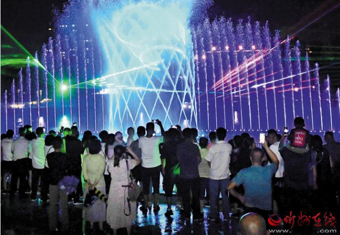 公園在注重園林、景觀建設(shè)的同時(shí),突出主題文化內(nèi)涵的展現(xiàn),湖水噴泉、觀賞果園、主題植物園、階梯花臺(tái)等特色園林具有觀賞性,園內(nèi)還配套建有遺山文化館、張拉膜廣場(chǎng)、健舞劇場(chǎng)、休閑茶吧、咖啡館等群眾休閑活動(dòng)場(chǎng)所,是又一惠及民生的心靈家園。圖為8月1日晚,市民在遺山公園噴泉廣場(chǎng)觀賞絢麗多彩的噴泉燈光秀。劉紀(jì)森 智芝龍 白曉明 胡 煒 攝