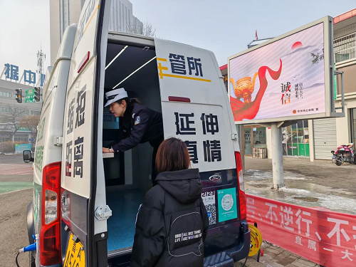 春節(jié)假期,城市、鄉(xiāng)村到處都彌漫著歡樂祥和的氣氛,初一至初七,在山西省忻州市忻府區(qū)光明西街古城北廣場、公園西街世紀(jì)花苑小區(qū)南門等人流量大、人員集中場所,忻州市公安局交警支隊(duì)的警郵車管便民服務(wù)車格外顯眼?!翱s短距離、延伸真情”,這輛承載著為駕駛?cè)颂峁崆橹艿椒?wù)、為車輛安全出行提供保障,被群眾稱為“流動車管所”的車管便民服務(wù)車讓寒冬暖流涌動。