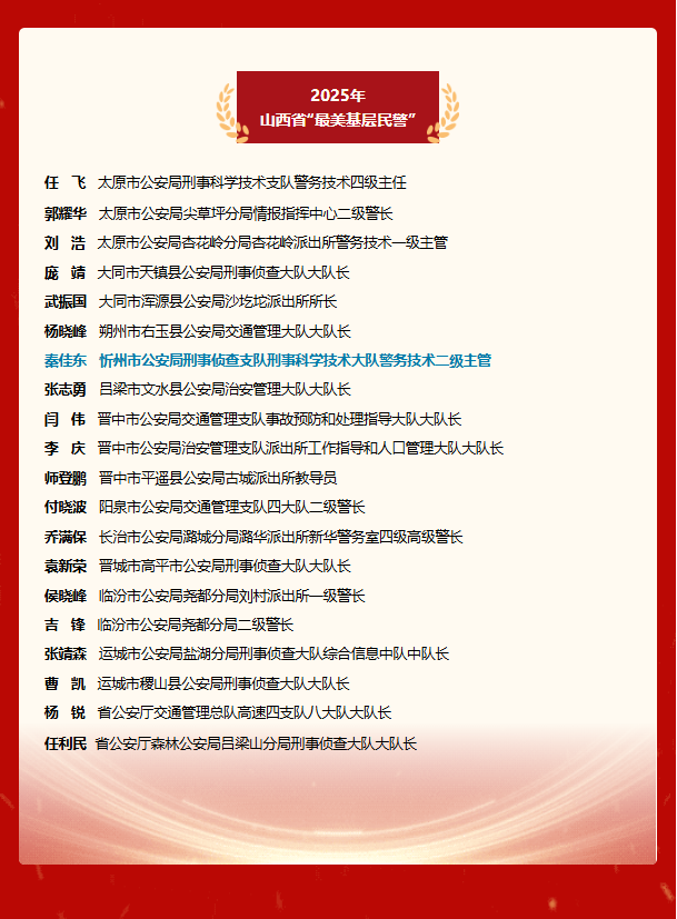 任飛、郭耀華、劉浩、龐靖、武振國、楊曉峰、秦佳東、張志勇、閆偉、李慶、師登鵬、付曉波、喬滿保、袁新榮、侯曉峰、吉鋒、張靖森、曹凱、楊銳、任利民20名同志光榮入選,其中,太原市公安局刑事科學(xué)技術(shù)支隊(duì)民警任飛還入選2025全國“最美基層民警”。
