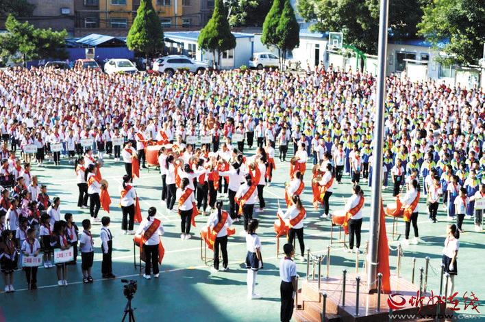 10日上午,統(tǒng)一著裝的少先隊(duì)員們精神抖擻地站在校門口廣場,以快閃告白的方式,齊誦贊美老師的詩詞,向全校老師致以最誠摯的告白。