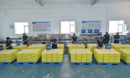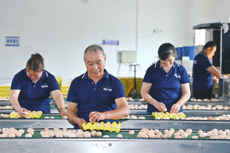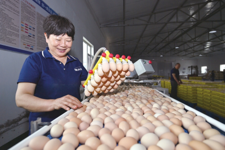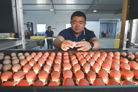 雞蛋通過自動分級機(jī)流向預(yù)先設(shè)定規(guī)格標(biāo)準(zhǔn)的生產(chǎn)線,工作人員再將大小一致的雞蛋收集碼盤。