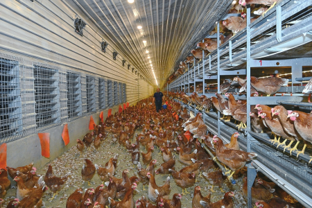 偏關(guān)永奧生態(tài)農(nóng)業(yè)的非籠養(yǎng)系統(tǒng)分為三層,底層是可以刨沙抖羽的沙浴區(qū),中層的棲架可供雞蜷臥打盹,雞群在頂層的食槽啄食。