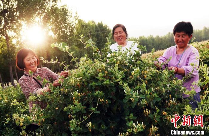 夕陽下,山西省運城市新絳縣澤掌鎮(zhèn)喬溝頭村,花農趙藕平(左)和鄰里采摘豐收的金銀花。高新生 攝