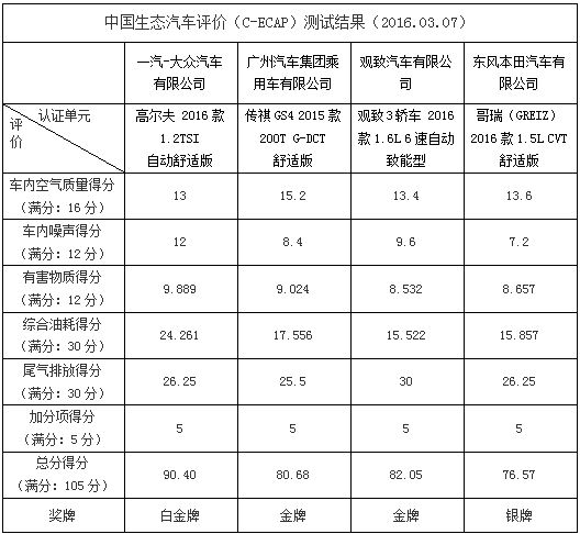 人民網(wǎng)天津3月9日電(鄂智超)日前,中國生態(tài)汽車評(píng)價(jià)(C-ECAP)新一批測(cè)試結(jié)果公布。本次共公布了四款車型,分別為一汽-大眾高爾夫 2016款 1.2TSI自動(dòng)舒適版(90.40分)、廣汽傳祺GS4 2015款 200T G-DCT舒適版(80.68分)、觀致3轎車 2016款1.6L 6速自動(dòng)致能型(82.05分)、東風(fēng)本田哥瑞 2016款1.5L CVT舒適版(76.57分)。其中一汽-大眾高爾夫車型獲得白金牌,廣汽傳祺GS4與觀致3轎車獲得金牌,東風(fēng)本田哥瑞獲銀牌。