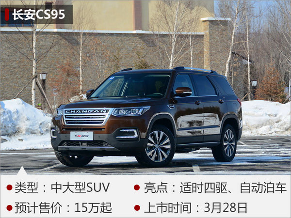 長安CS95是一款中大型SUV,于去年廣州車展正式發(fā)布,并將在今年3月28日上市。CS95的長寬高為4949*1930*1785mm,軸距2810mm。新車搭載全景天窗、車頂行李架以及LED大燈組等。在內(nèi)部配置方面,長安CS95配備了方向盤加熱、定速巡航等實(shí)用性配置。此外,新車還配備了ABS防抱死、車身穩(wěn)定控制系統(tǒng)等安全性配置。CS95搭載長安汽車自主研發(fā)的藍(lán)鯨2.0TGDI發(fā)動(dòng)機(jī),最大功率171kW,峰值扭矩360Nm。