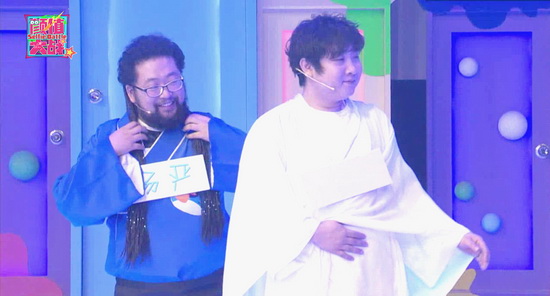 一開場兩人被發(fā)糖——“選妃”可抱美人歸。遮擋住臉龐的各位“妃子”穿著古風(fēng)裙,俏麗非凡的樣子讓兩位嘉賓欣喜不已,想著總算可以和漂亮的姑娘們搭檔了,誰料半路殺出王守英,頭戴瓜子身披綠紗,一身自制衣服就劫走了喬杉,看著這二人配對成功,修睿還做著自己會和小美女搭檔的美夢,然而張大大直接判決,修睿配對小甜甜。