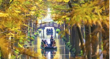 初冬時(shí)節(jié),江蘇興化里下河國家濕地公園層林盡染、色彩斑斕,如畫美景吸引不少游客前來游玩。周社根攝(人民圖片網(wǎng))