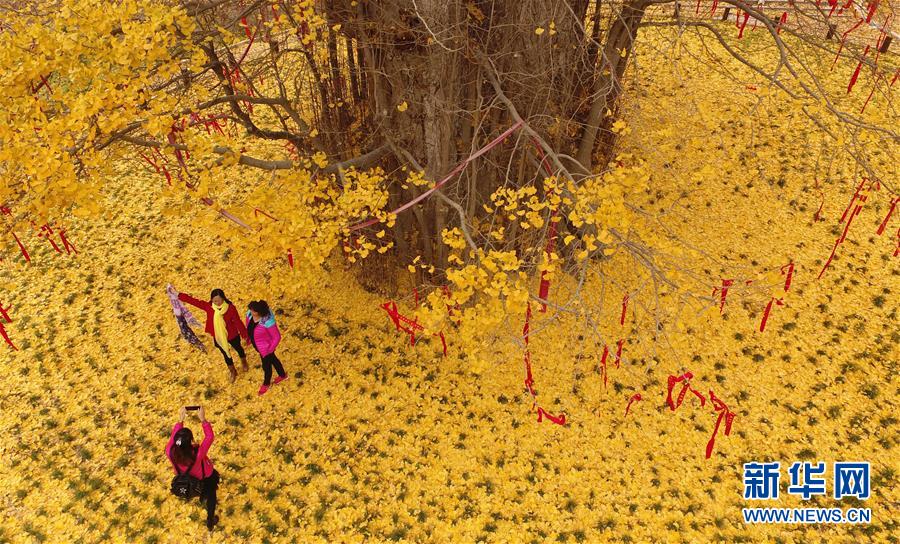 11月19日,游客在留壩縣玉皇廟鎮(zhèn)參觀千年銀杏樹(shù)。初冬時(shí)節(jié),在秦嶺深處的陜西省留壩縣玉皇廟鎮(zhèn)石窯壩村,一棵千年古銀杏樹(shù)的落葉宛如金色地毯,甚為壯觀。據(jù)當(dāng)?shù)亓謽I(yè)部門介紹,該樹(shù)胸徑為4.45米,現(xiàn)有高度29米。新華社記者 陶明 攝