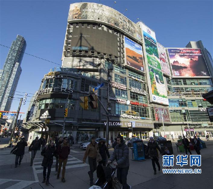 這是1月1日在加拿大多倫多市中心的鄧達(dá)斯廣場拍攝的“美麗中國——2017絲綢之路旅游年”主題宣傳廣告牌。從2016年12月26日起,由中國國家旅游局推出、以“美麗中國——2017絲綢之路旅游年”為主題的大型旅游宣傳廣告在加拿大多倫多市中心鄧達(dá)斯廣場亮相,向人們展示中國美麗而豐富的旅游資源。整個活動將持續(xù)5周。新華社發(fā)(鄒崢攝)