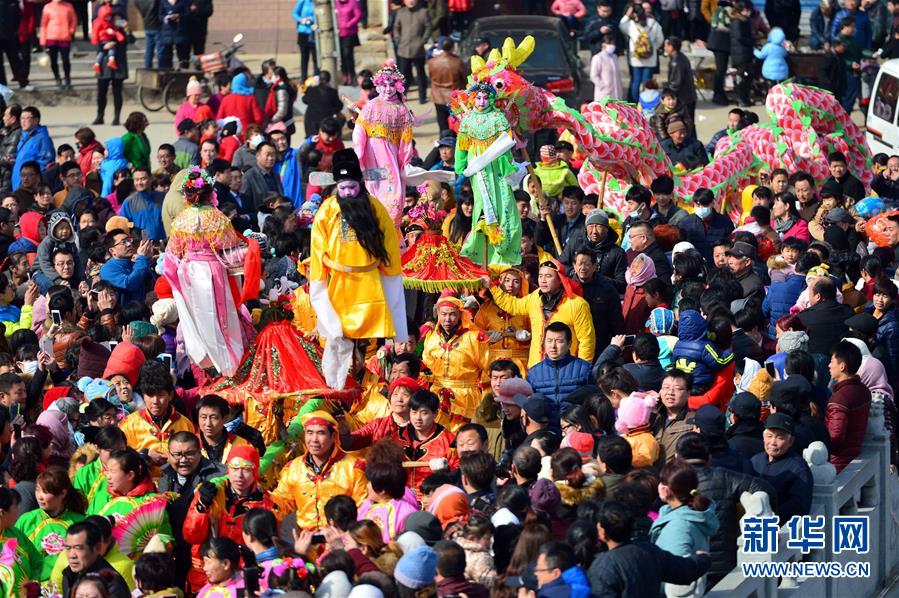 2月21日,社火隊(duì)在進(jìn)行巡游拜年。當(dāng)日,有著千年歷史的傳統(tǒng)村落——山東省章丘市三德范村組織31個(gè)社火隊(duì)舉行社火巡游拜年活動,在元宵佳節(jié)來臨之際為鄉(xiāng)親們送祝福。新華社記者 郭緒雷攝