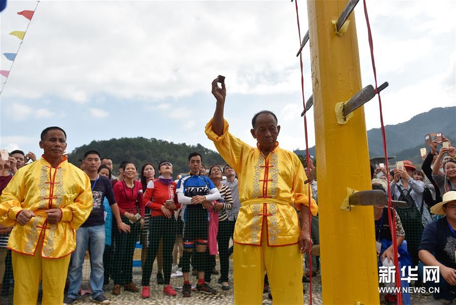 農(nóng)歷十月十五前后,福建西部武平縣各山村陸續(xù)進入農(nóng)閑時節(jié)。按照當?shù)仫L(fēng)俗,不同村子各自擇日舉辦民間活動,其中較有代表性的就是“上刀山”絕技?!吧系渡健苯^技在閩西山村流傳已有數(shù)百年歷史,表演者需光腳順著磨得鋒利閃亮的36把鋼刀,攀登至8米高的杉木柱子頂部,接受長者祝福,祈求風(fēng)調(diào)雨順、五谷豐登。新華社記者 宋為偉 攝