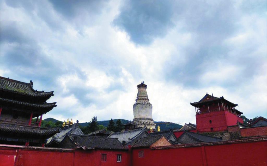 五臺(tái)山最具代表性的鈴聲就是從塔院寺高聳入云的大白塔上傳出的風(fēng)鈴聲。大白塔環(huán)周83.8米,通高75.3米,塔高56.4米,比北京北海白塔還高20.5米,比代縣阿育王塔高16.5米,是元大德五年(1301年)由尼泊爾匠師阿尼哥設(shè)計(jì)建造的尼泊爾式大塔,也是我國(guó)現(xiàn)存元代最高的覆缽式塔建筑。大白塔基座呈東、西、南、北、東南、東北、西南、西北八角形,塔身上面13層,呈由粗及細(xì)的輪狀造型,稱“十三天”,又名“十三相輪”。“十三天”上面蓋著8塊銅板,按乾、坎、艮、震、巽、離、坤、兌八卦位置安裝,周長(zhǎng)23.1米,檐邊吊裝銅質(zhì)垂檐36塊,共安裝風(fēng)鈴108個(gè),連同束腰風(fēng)鈴共252個(gè)。塔頂裝有高5.4米的鍍金寶瓶。整座白塔形如藻瓶,上下比例協(xié)調(diào),造型別致典雅。每當(dāng)風(fēng)吹鈴響,風(fēng)鐸鳴四端,悠然成風(fēng)韻,讓人油然而生崇敬之感。