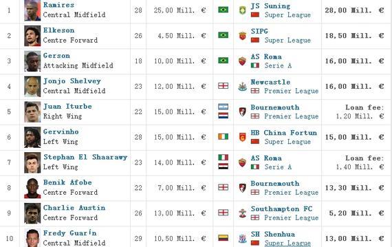 截至目前,中國俱樂部球員轉(zhuǎn)會(huì)費(fèi)(含轉(zhuǎn)入及轉(zhuǎn)出)排名前10位的分別是拉米雷斯(2800萬歐元)、埃爾克森(1850萬歐元)、熱爾維尼奧(1500萬歐元)、高拉特(1500萬歐元)、保利尼奧(1400萬歐元)、登巴巴(1300萬歐元)、瓜林(1200萬歐元)、吉安(1200萬歐元)、畢津浩(1114萬歐元)、阿蘭(1110萬歐元),1100萬歐元轉(zhuǎn)會(huì)費(fèi)的球員進(jìn)不了前10位,這在一年之前是不可想象的。而像格烏瓦尼奧(1100萬歐元)、張鷺(980萬歐元)、孫可(920萬歐元)、巴里奧斯(850萬歐元)、吉爾(850萬歐元)、孔卡(820萬歐元)、奧古斯托(800萬歐元)、蒙蒂略(750萬歐元)、迪亞曼蒂(690萬歐元)都被擠出了前10位。