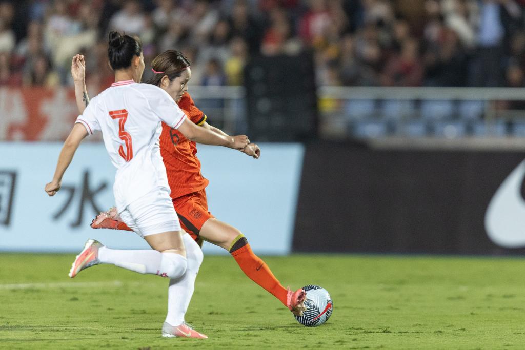 10月29日,中國(guó)隊(duì)球員張馨(右)在比賽中射門。新華社記者 黃偉 攝 下半場(chǎng)越南隊(duì)逐漸找到狀態(tài),發(fā)起了多次有威脅的進(jìn)攻。然而雙方拼搶到補(bǔ)時(shí)階段,越南隊(duì)陳氏秋草解圍不慎,踢入一記“烏龍球”,比分最后鎖定在2:0。