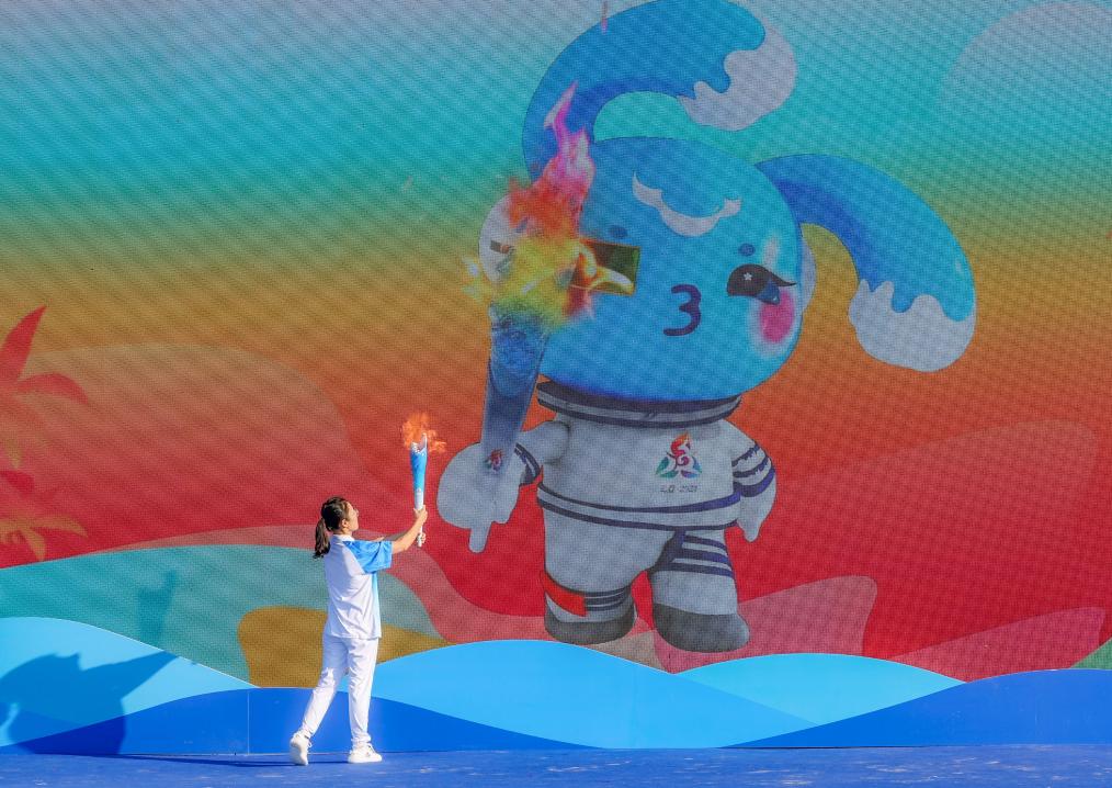11月17日,火炬手韓曉燕在起跑儀式上與本屆運(yùn)動(dòng)會(huì)吉祥物“吉貝”對(duì)接,點(diǎn)燃火炬。新華社記者 陳朔 攝