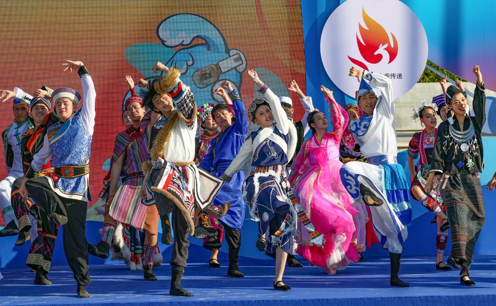11月17日,演員在第十二屆全國(guó)少數(shù)民族傳統(tǒng)體育運(yùn)動(dòng)會(huì)火炬實(shí)地傳遞活動(dòng)起跑儀式上表演。新華社記者 陳朔 攝