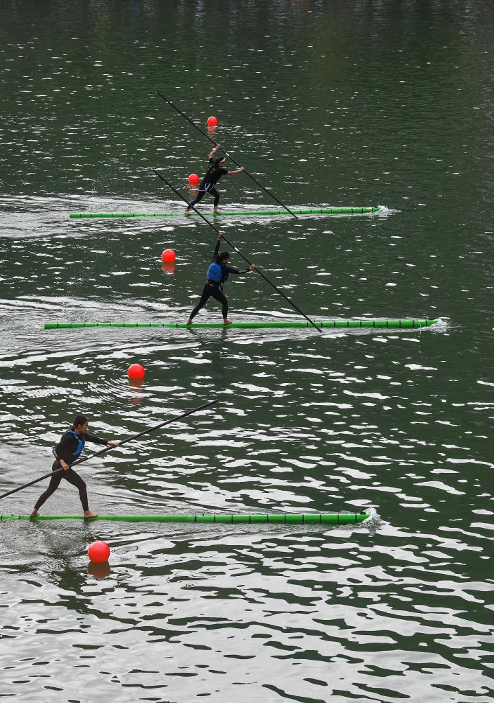 6月11日,選手在貴州省鎮(zhèn)遠(yuǎn)縣?陽(yáng)河上進(jìn)行獨(dú)竹漂比賽。新華社記者 楊文斌 攝