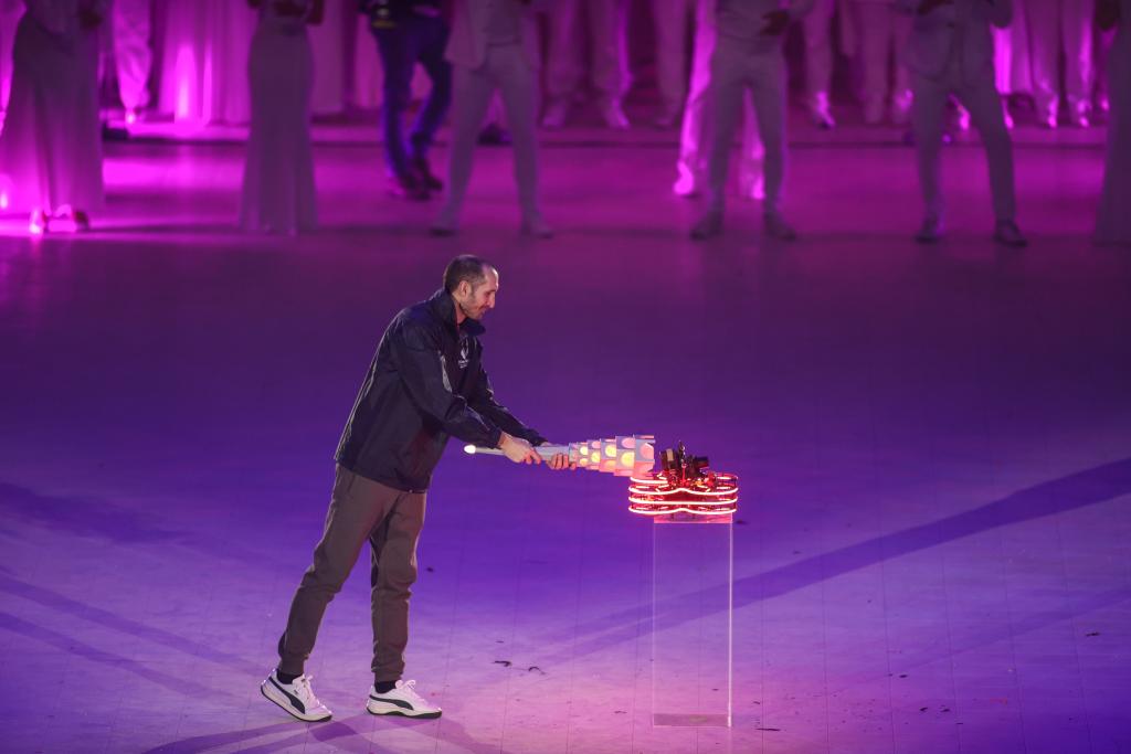 意大利體育和青年部長(zhǎng)安德烈亞·阿博迪出席開幕式并宣布運(yùn)動(dòng)會(huì)開幕。在充滿風(fēng)情的歌舞、魔術(shù)和雜技表演后,意大利足球名宿基耶利尼手持火炬,將一臺(tái)無(wú)人機(jī)“激活”。隨后,發(fā)光的無(wú)人機(jī)從奧林匹克體育館飛向都靈王宮,將矗立在王宮前的主火炬點(diǎn)亮。