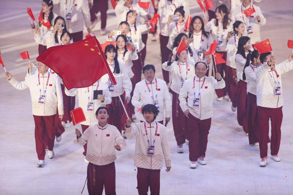 1月13日,中國(guó)大學(xué)生體育代表團(tuán)在開幕式上入場(chǎng)。新華社記者 李京 攝