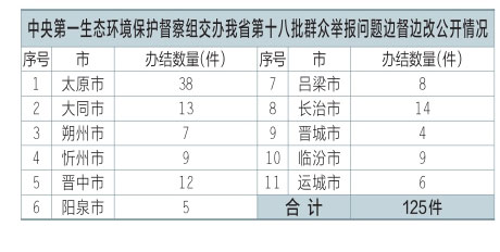 中央第一生態(tài)環(huán)境保護督察組交辦我省第十八批群眾舉報問題125件,辦結(jié)125件。公示125件,其中太原市38件、大同市13件、朔州市7件、忻州市9件、晉中市12件、陽泉市5件、呂梁市8件、長治市14件、晉城市4件、臨汾市9件、運城市6件??傻卿浬轿魇∪嗣裾W(wǎng)站或掃描二維碼查閱群眾信訪舉報轉(zhuǎn)辦和邊督邊改公開情況一覽表。