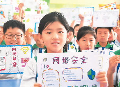 河北省邯鄲市永年區(qū)洺州小學的孩子們展示網(wǎng)絡(luò)安全手抄報。胡高雷攝(人民視覺)
