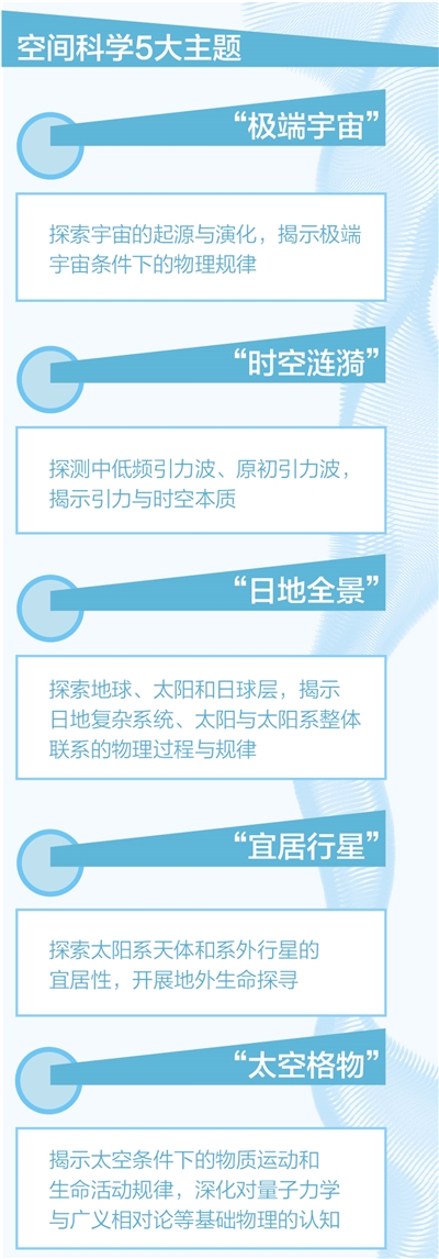 “太空格物”主題。主要是揭示太空條件下的物質(zhì)運(yùn)動和生命活動規(guī)律,深化對量子力學(xué)與廣義相對論等基礎(chǔ)物理的認(rèn)知。優(yōu)先發(fā)展方向包括微重力科學(xué)、量子力學(xué)與廣義相對論、空間生命科學(xué)等。