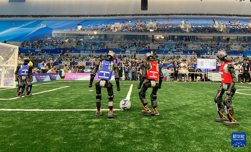 圖為2025世界人形機(jī)器人運動會上機(jī)器人在踢足球。新華社記者 魏夢佳 攝