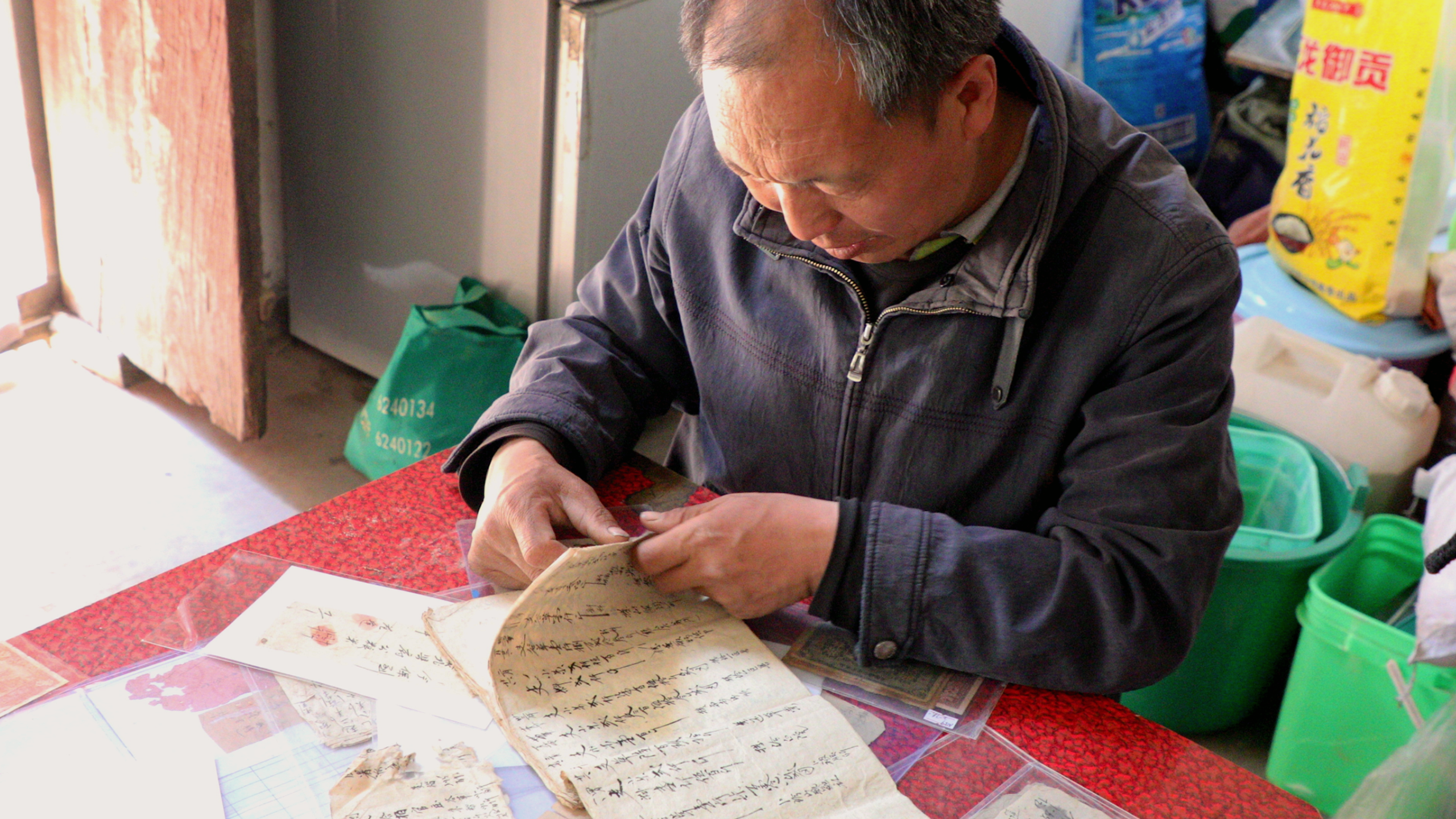 在孔家峧村郭海波家的老宅,土墻小院內(nèi)另有乾坤。在最里間的臥室內(nèi),一處地磚已經(jīng)下沉,里面放置著一口陶甕。記者看到,陶甕在原地已經(jīng)被玻璃罩保護起來,而陶甕內(nèi)已取出的珍藏文獻,把每一位來人帶回那段烽火歲月。