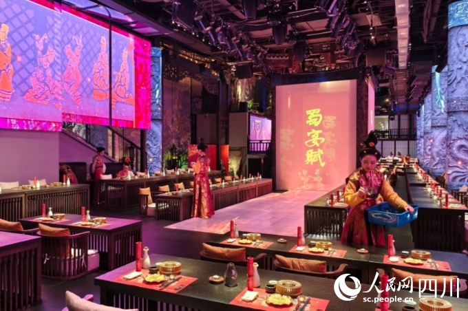 東郊記憶園區(qū)內(nèi)以蜀地文化為創(chuàng)作背景,溯源中國(guó)傳統(tǒng)宴飲儀禮打造的全景沉浸式漢文化主題餐秀——蜀宴賦。人民網(wǎng) 趙祖樂攝