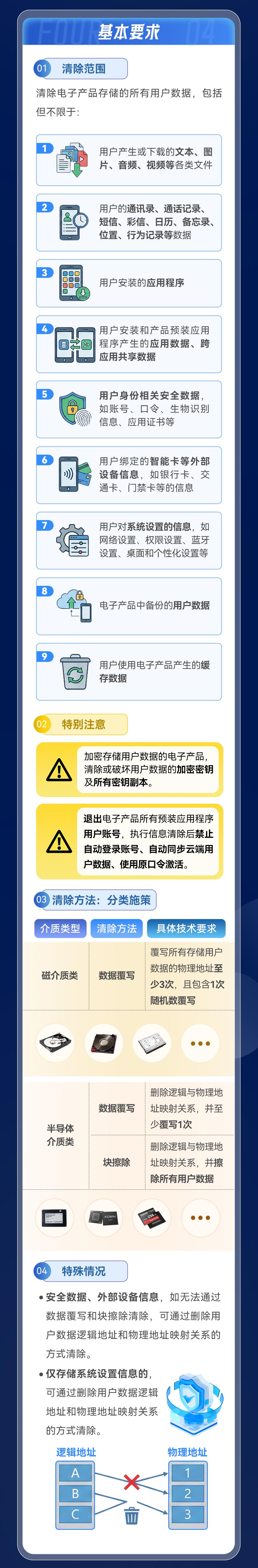 需要特別強調的是:對于處理涉及國家秘密的電子產品,其信息清除工作不適用此國家標準的一般性要求,而必須嚴格依照保密法等國家保密法律法規(guī)及相關規(guī)定執(zhí)行。
