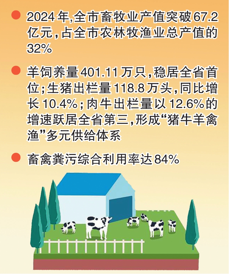 2024年,我市畜牧業(yè)產(chǎn)值突破67.2億元,占全市農(nóng)林牧漁業(yè)總產(chǎn)值的32%;羊飼養(yǎng)量以401.11萬只的規(guī)模穩(wěn)居山西省首位;畜禽糞污綜合利用率達(dá)84%……一組組數(shù)據(jù)背后,正是這座北方畜牧強(qiáng)市以“穩(wěn)產(chǎn)保供”筑牢產(chǎn)業(yè)基底、以“全鏈升級”助力鄉(xiāng)村振興的生動實(shí)踐。