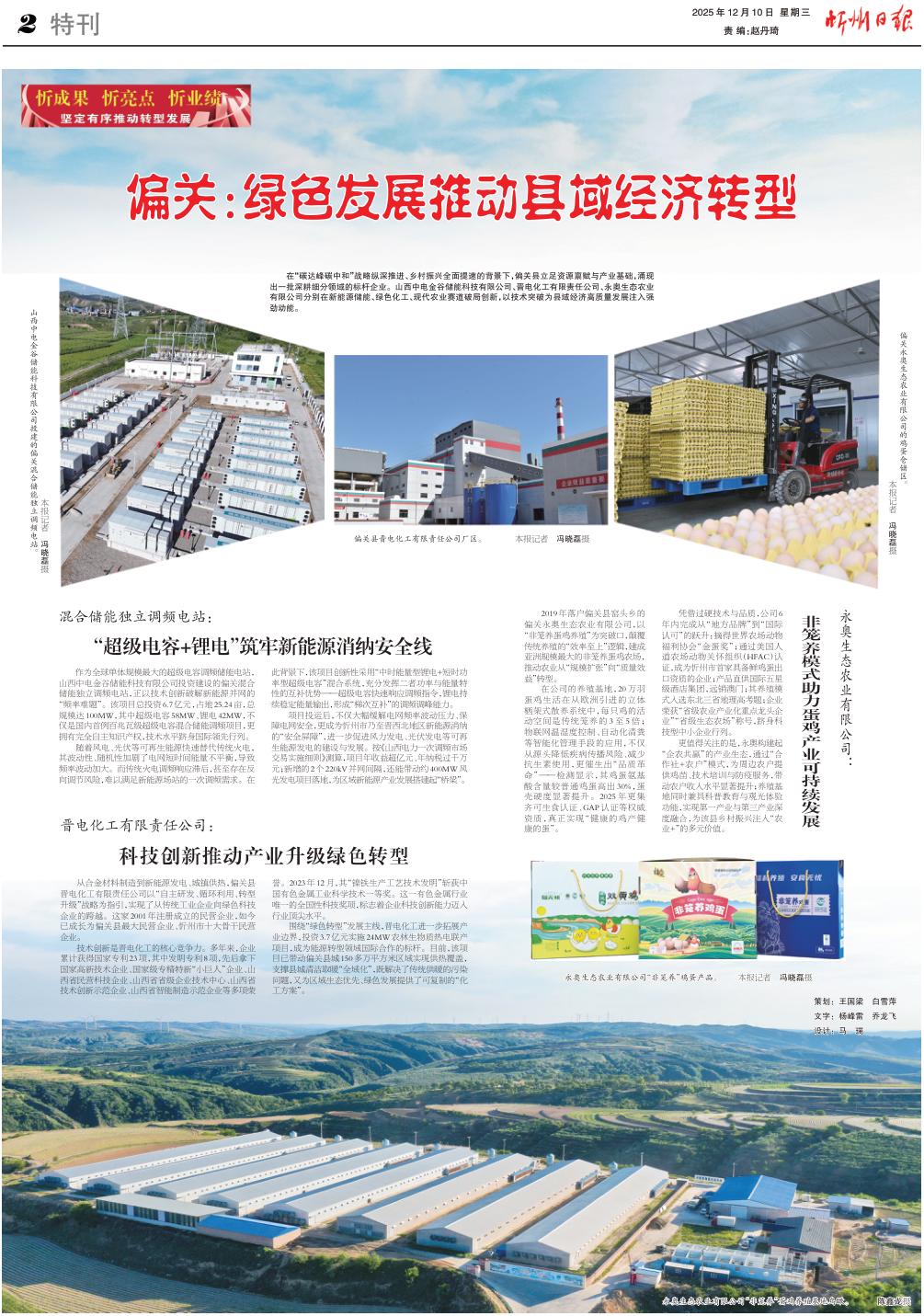 在“碳達(dá)峰碳中和”戰(zhàn)略縱深推進(jìn)、鄉(xiāng)村振興全面提速的背景下,偏關(guān)縣立足資源稟賦與產(chǎn)業(yè)基礎(chǔ),涌現(xiàn)出一批深耕細(xì)分領(lǐng)域的標(biāo)桿企業(yè)。山西中電金谷儲能科技有限公司、晉電化工有限責(zé)任公司、永奧生態(tài)農(nóng)業(yè)有限公司分別在新能源儲能、綠色化工、現(xiàn)代農(nóng)業(yè)賽道破局創(chuàng)新,以技術(shù)突破為縣域經(jīng)濟(jì)高質(zhì)量發(fā)展注入強勁動能。