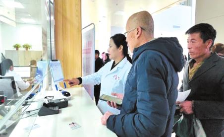 醫(yī)院工作人員引導(dǎo)就診病人完成注冊流程
