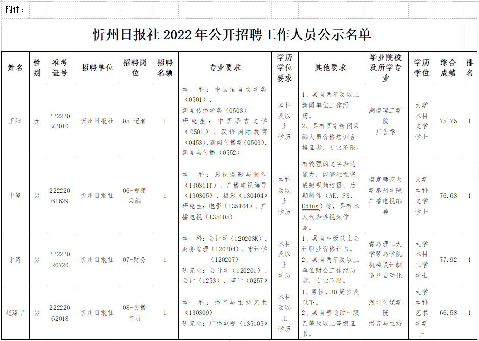 附件: 忻州日?qǐng)?bào)社2022年公開(kāi)招聘工作人員公示名單