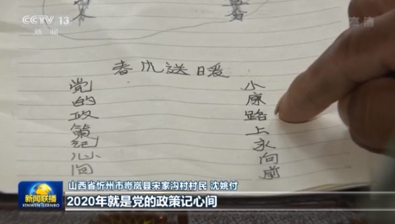 山西省忻州市岢嵐縣宋家溝村村民沈姚付:2019年我寫(xiě)脫貧不忘共產(chǎn)黨,感恩四方,就是四面八方的游客來(lái)吃我的涼粉,也是幫助我脫貧。2020年就是黨的政策記心間,小康路上要永遠(yuǎn)向前,春風(fēng)送暖。