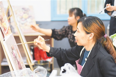 近年來,湖南省瀏陽市小河鄉(xiāng)引進農(nóng)民畫室產(chǎn)業(yè),讓農(nóng)民可以在家務農(nóng)時利用空余時間務工。小河鄉(xiāng)現(xiàn)有460余名農(nóng)民畫師,累計帶動50余名貧困戶參與。圖為小河鄉(xiāng)烏石村村民在繪制油畫。