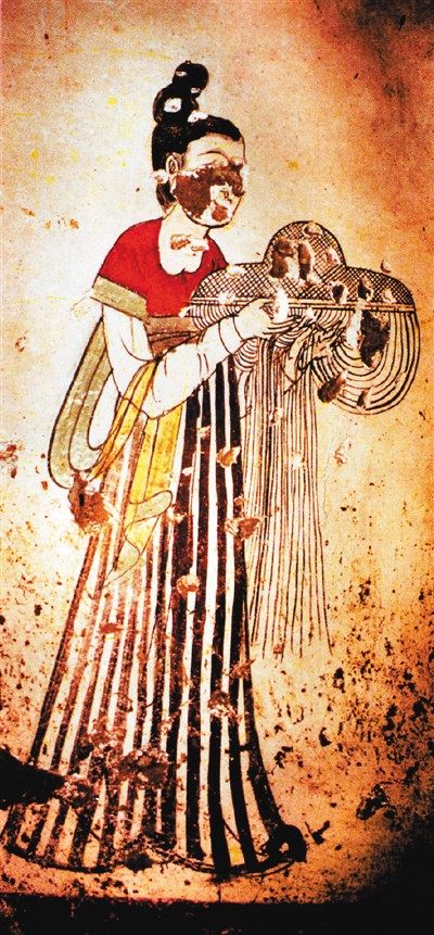 唐燕妃墓捧帷帽侍女壁畫(huà),昭陵博物館藏。1990年,唐太宗的妃子燕氏的墓室被清理出來(lái),墓室壁畫(huà)中,宮女手中所捧的帷帽垂掛著一圈長(zhǎng)絲穗,形成一道薄幕,有一定衛(wèi)生防護(hù)功能。