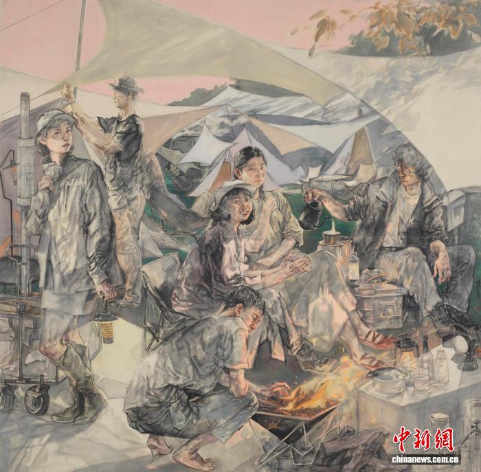 以畫家藺潔青的中國畫《清風(fēng)徐來》為例,其是浙江省第十五屆美術(shù)作品展金獎(jiǎng)作品,以傳統(tǒng)人物畫技法表現(xiàn)當(dāng)代青年郊野露營場景,通過描繪清風(fēng)拂過林間被永恒定格的瞬間,傳遞都市人向往自然、追求心靈自由的當(dāng)代精神,展現(xiàn)出中國傳統(tǒng)繪畫語言在表現(xiàn)現(xiàn)實(shí)題材上的蓬勃生命力。