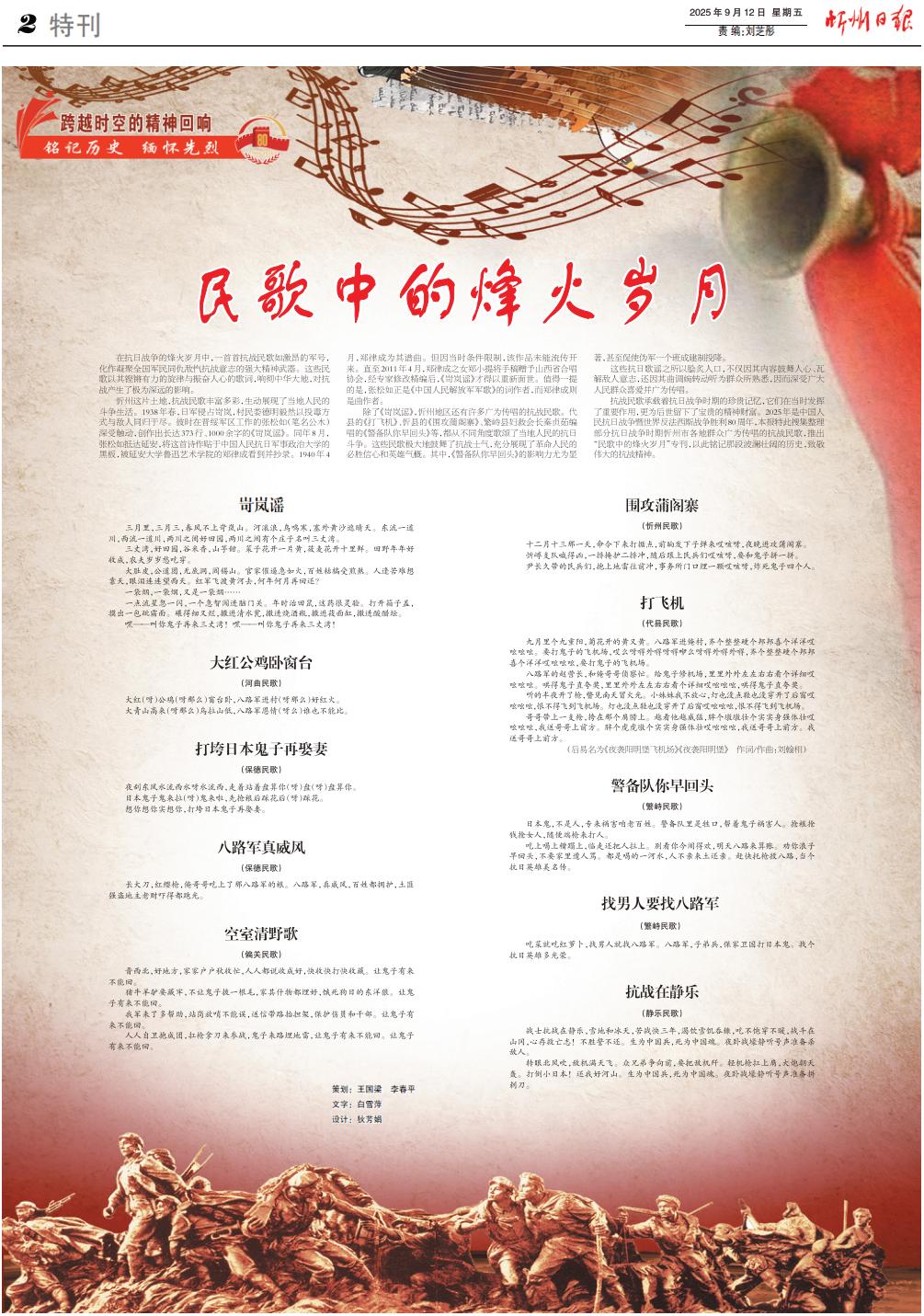 抗戰(zhàn)民歌承載著抗日戰(zhàn)爭時(shí)期的珍貴記憶,它們?cè)诋?dāng)時(shí)發(fā)揮了重要作用,更為后世留下了寶貴的精神財(cái)富。2025年是中國人民抗日戰(zhàn)爭暨世界反法西斯戰(zhàn)爭勝利80周年,本報(bào)特此搜集整理部分抗日戰(zhàn)爭時(shí)期忻州市各地群眾廣為傳唱的抗戰(zhàn)民歌,推出“民歌中的烽火歲月”專刊,以此銘記那段波瀾壯闊的歷史,致敬偉大的抗戰(zhàn)精神。