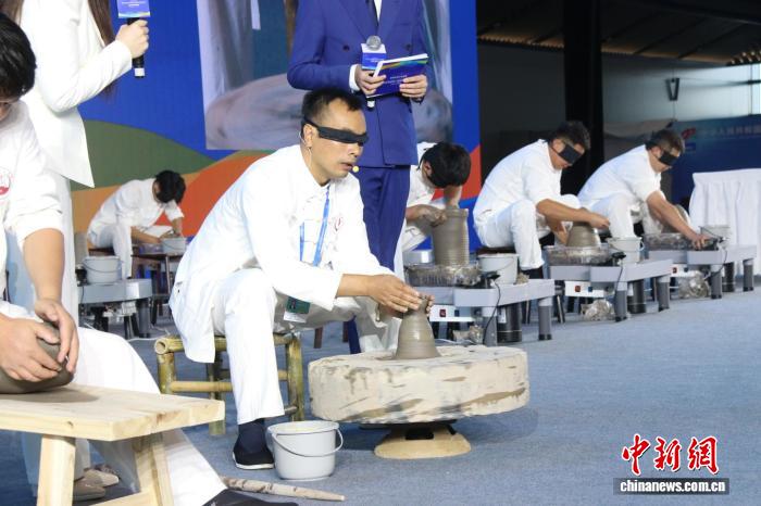 圖為許昌陶瓷職業(yè)學院特聘教授郭君健展示蒙眼拉坯。 張楠 攝