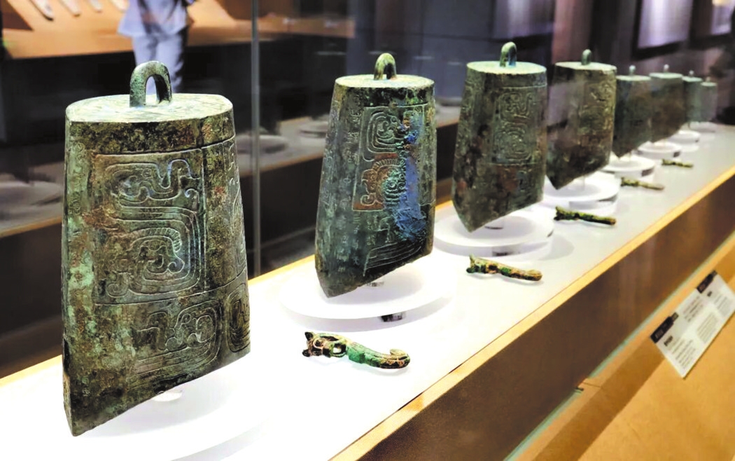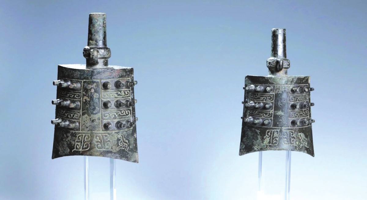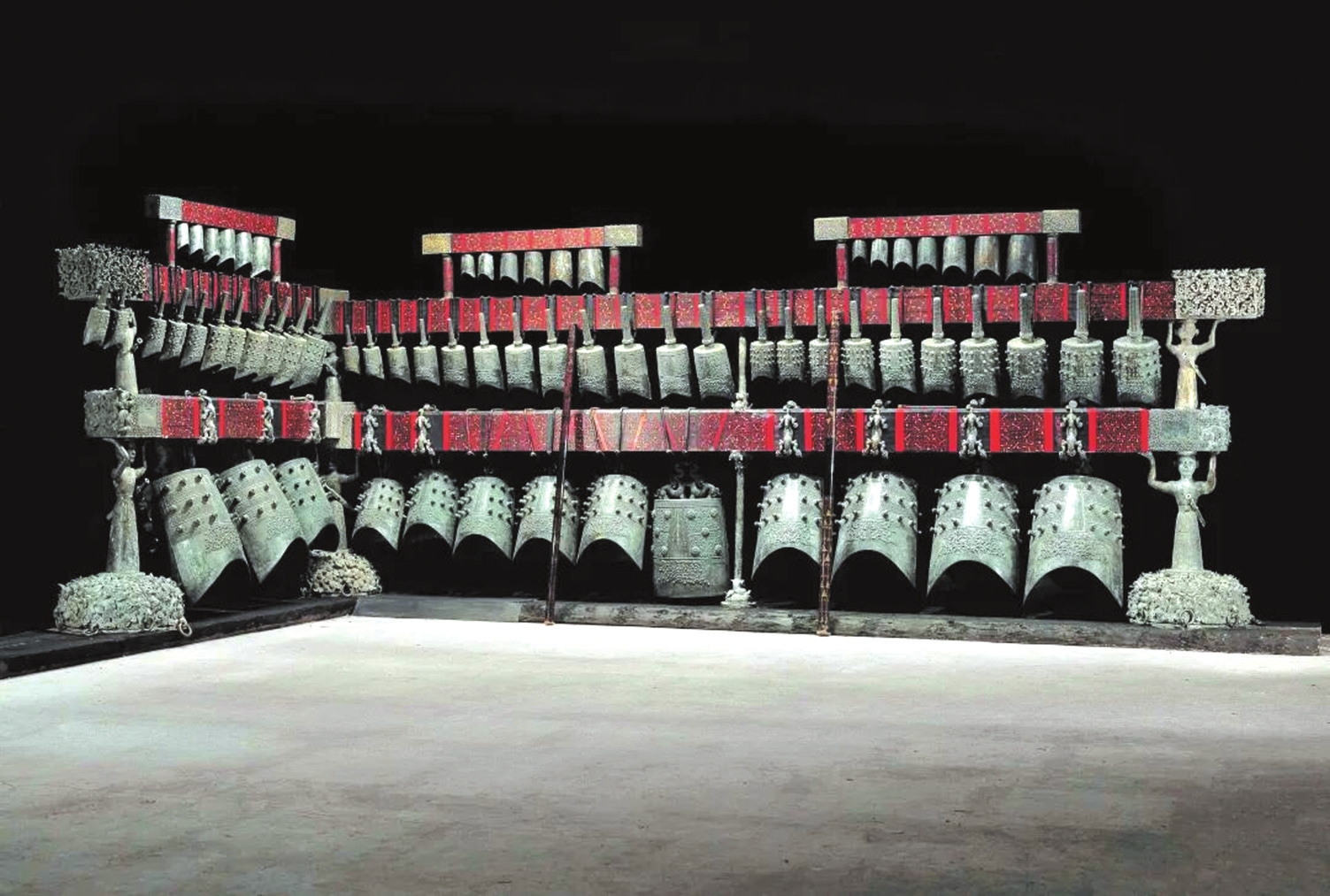 最具代表性的樂鐘無疑是“青銅之冠”的曾侯乙編鐘,它展現(xiàn)了先秦禮樂文明與青銅鑄造技術(shù)的最高成就。曾侯乙編鐘是戰(zhàn)國早期曾國國君的“禮樂重器”,1978年出土于今湖北隨州的曾侯乙墓,是迄今發(fā)現(xiàn)數(shù)量最多、保存最好、音律最全、氣勢(shì)最宏偉的一套編鐘,共65件,分3層8組懸掛于彩漆鐘架之上,鐘體總重達(dá)2.5噸。整套編鐘低音渾厚、中音圓潤、高音清脆,音域?qū)拸V,而且中心音域內(nèi)半音齊備,可以旋宮轉(zhuǎn)調(diào),演奏各種音樂。1978年8月1日,沉寂了2400多年的曾侯乙編鐘演奏了《東方紅》《國際歌》和古曲《楚殤》、民族歌曲《草原上升起不落的太陽》等各種樂曲,樂音悠揚(yáng)回蕩。
